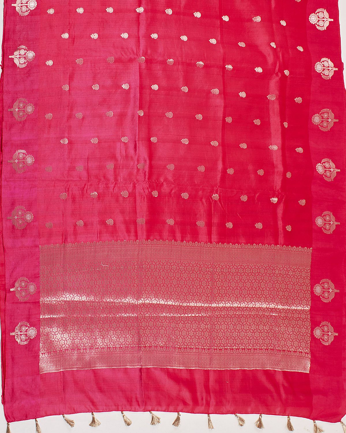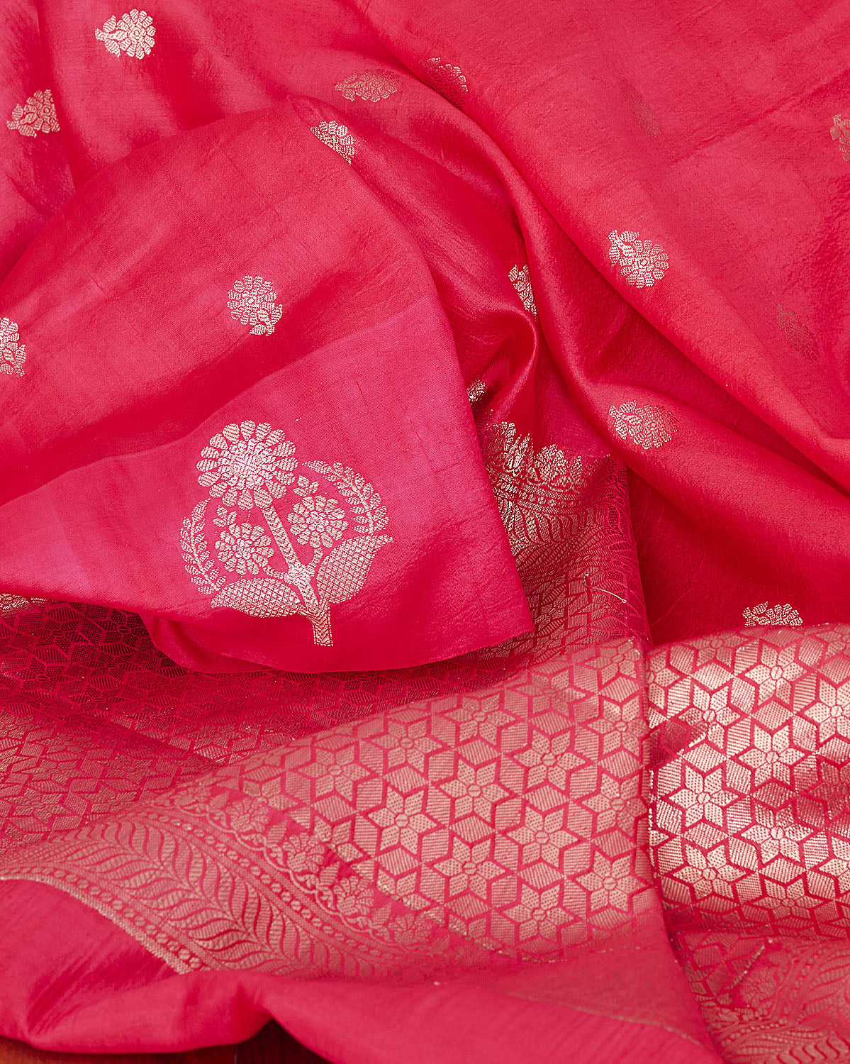 An auspicious rani pink silk saree, for the ceremonial look on all your special occasions.