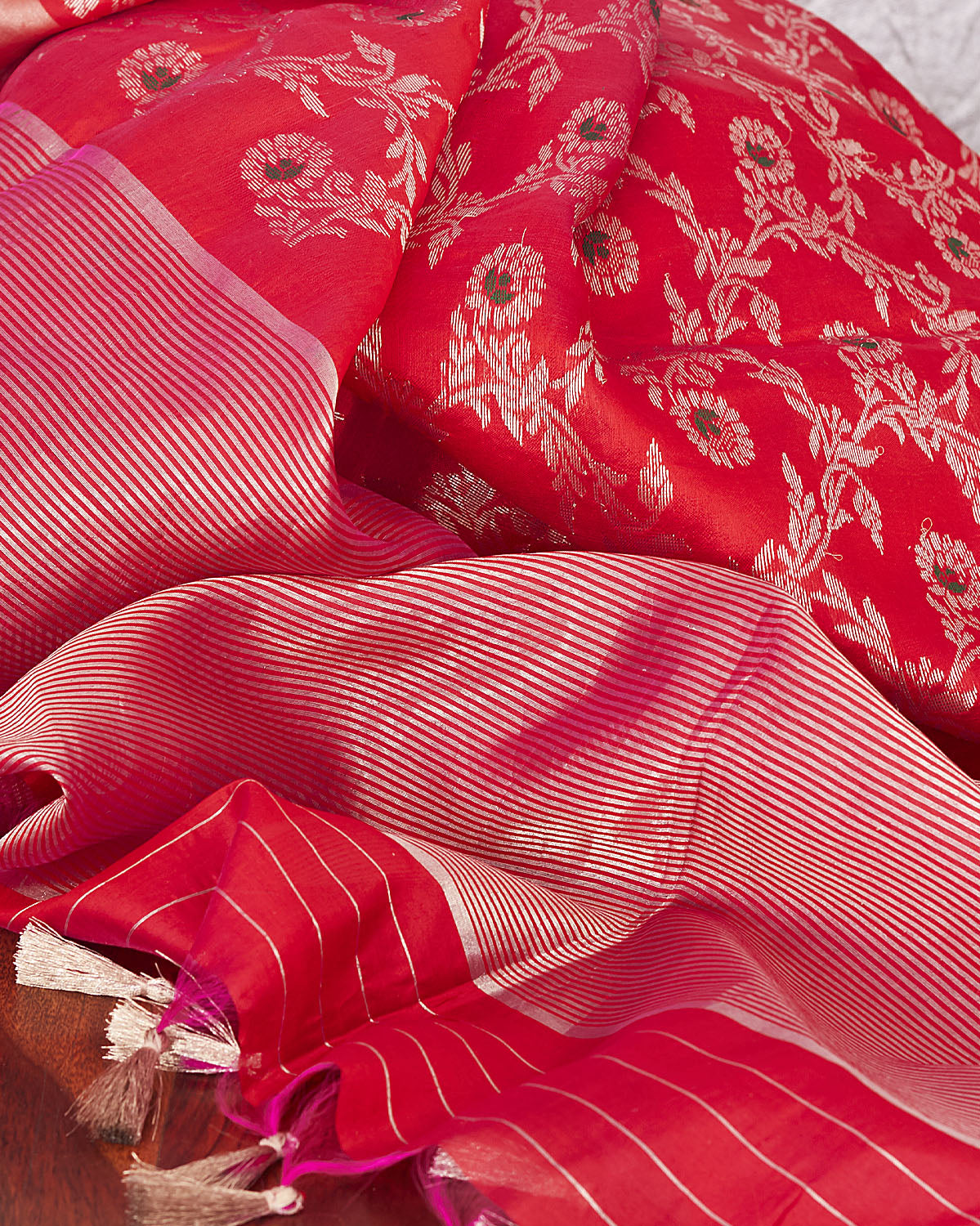 A striking ruby red silk saree, a perfect statement wear for all your special occasions.