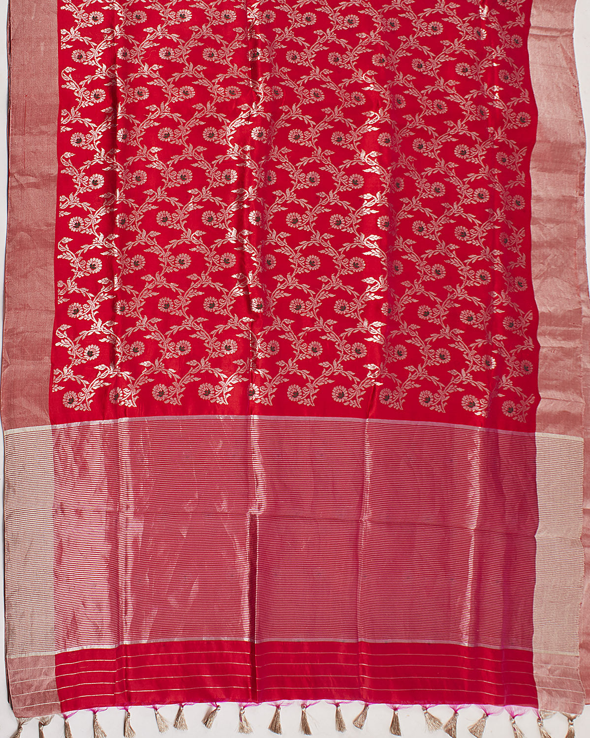 main body: Light gold zari & meena Kari floral jaal centre & palla woven in kadhuwa technique with light gold tissue border.