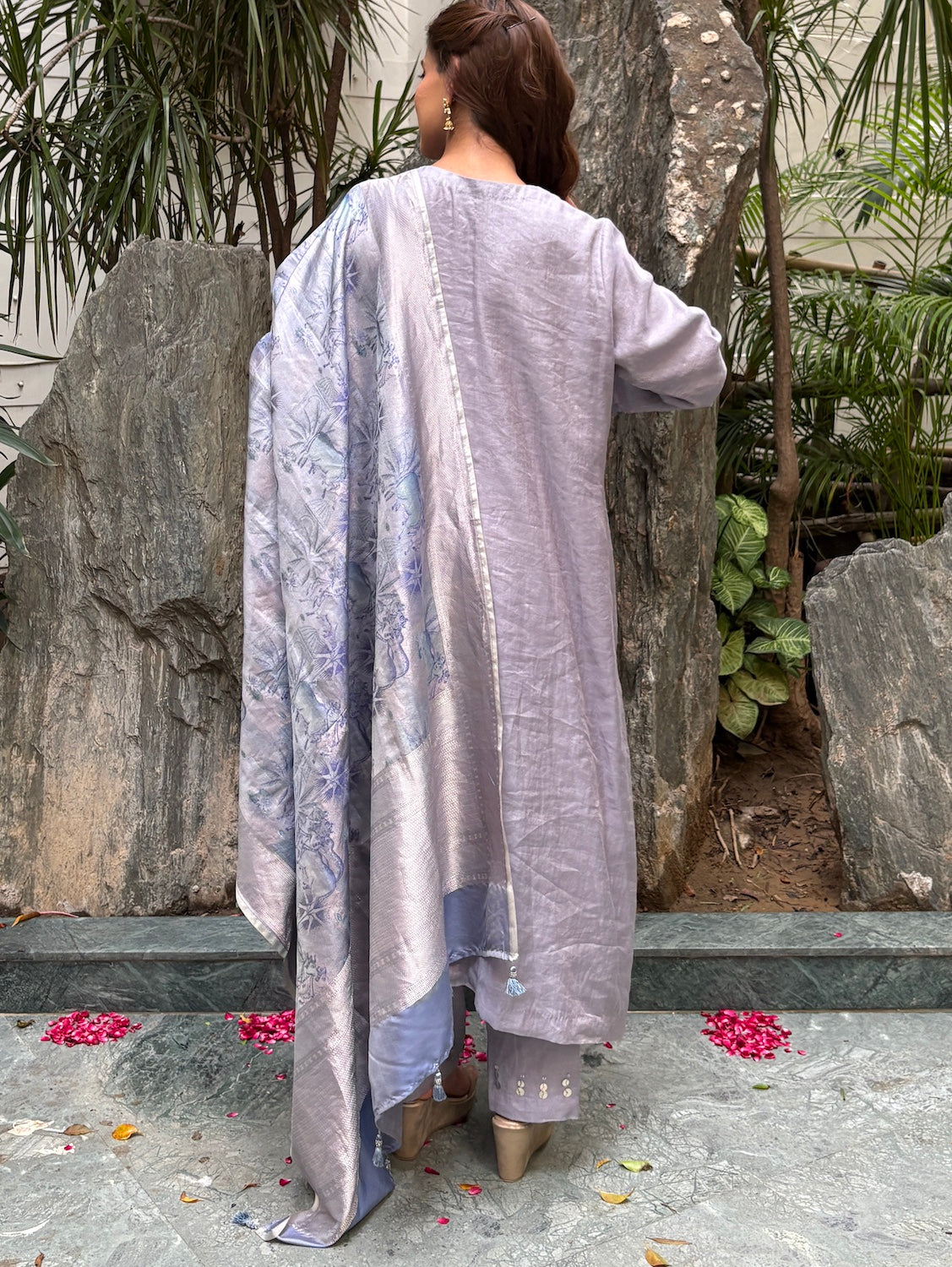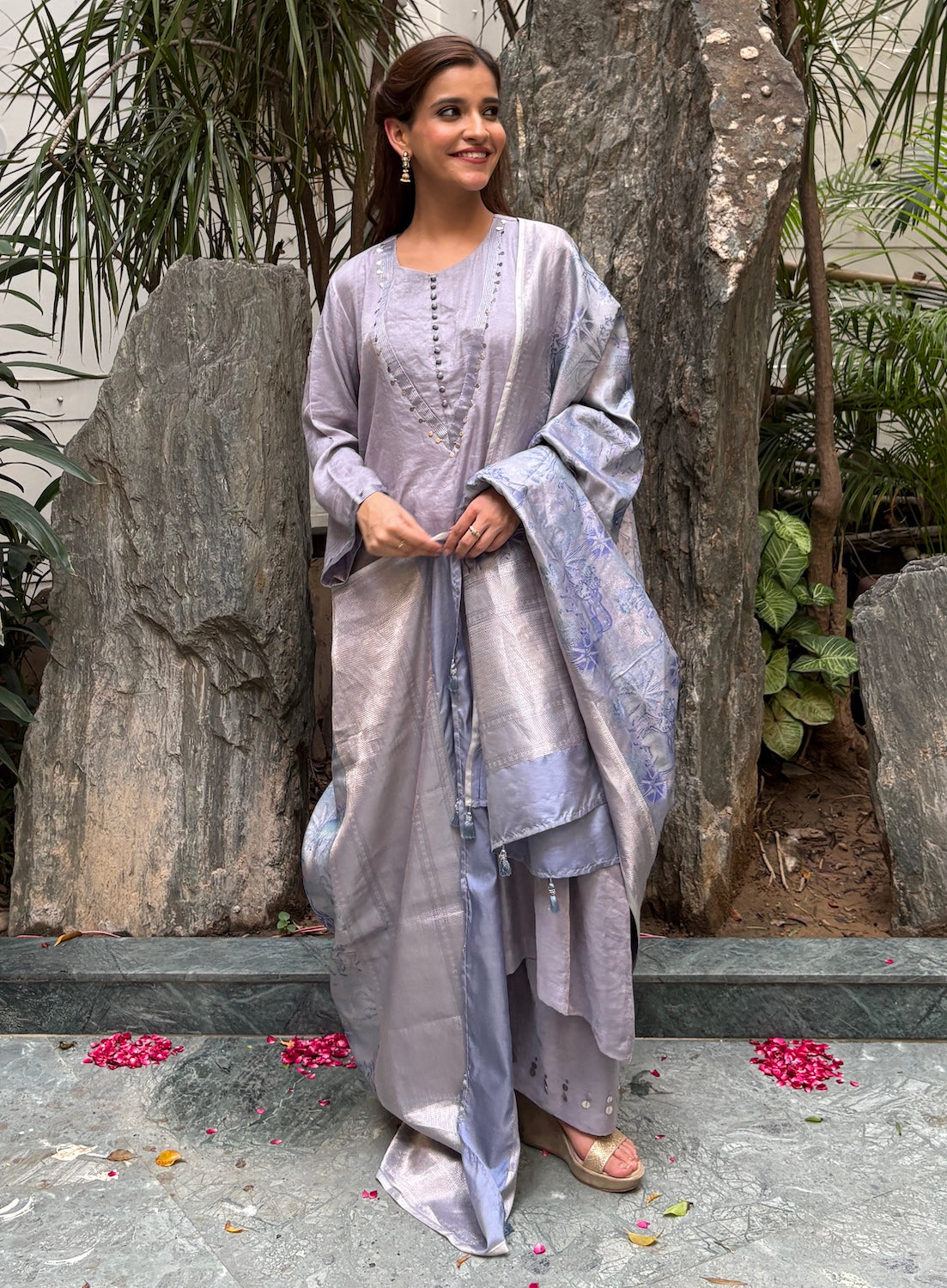 Kurta: Kurta has stripe tissue detailing on front yoke highlighted with hand embroidered coin work. Hand embroidered coin detail on sleeves.
