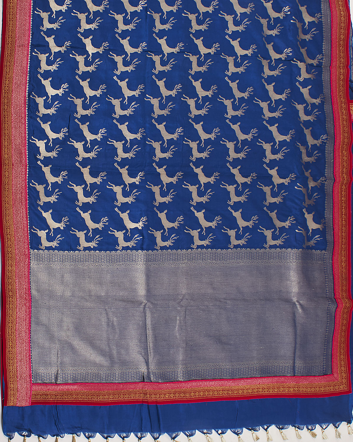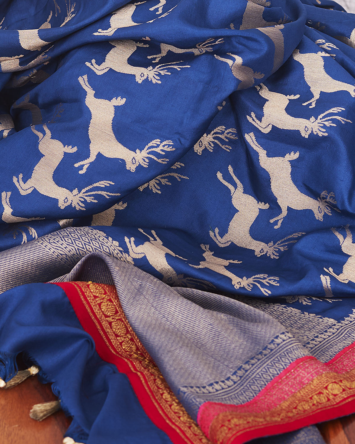 Inspired by Pichwai art of Rajasthan, a graceful and charming saree with beautiful deer motifs to compliment your artistic side, poetry in motion.