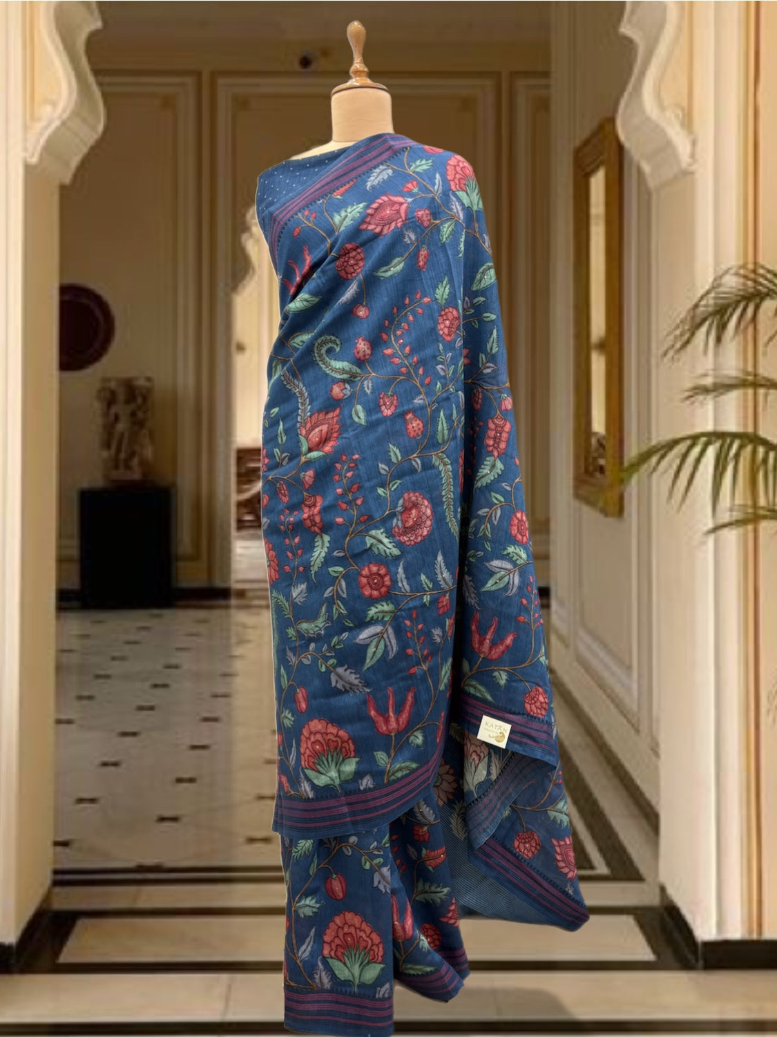 main body: Digital print kalamkari pattern in centre highlighted with delicate mirror embroidery. Contrast charcoal & brick resham border & palla.