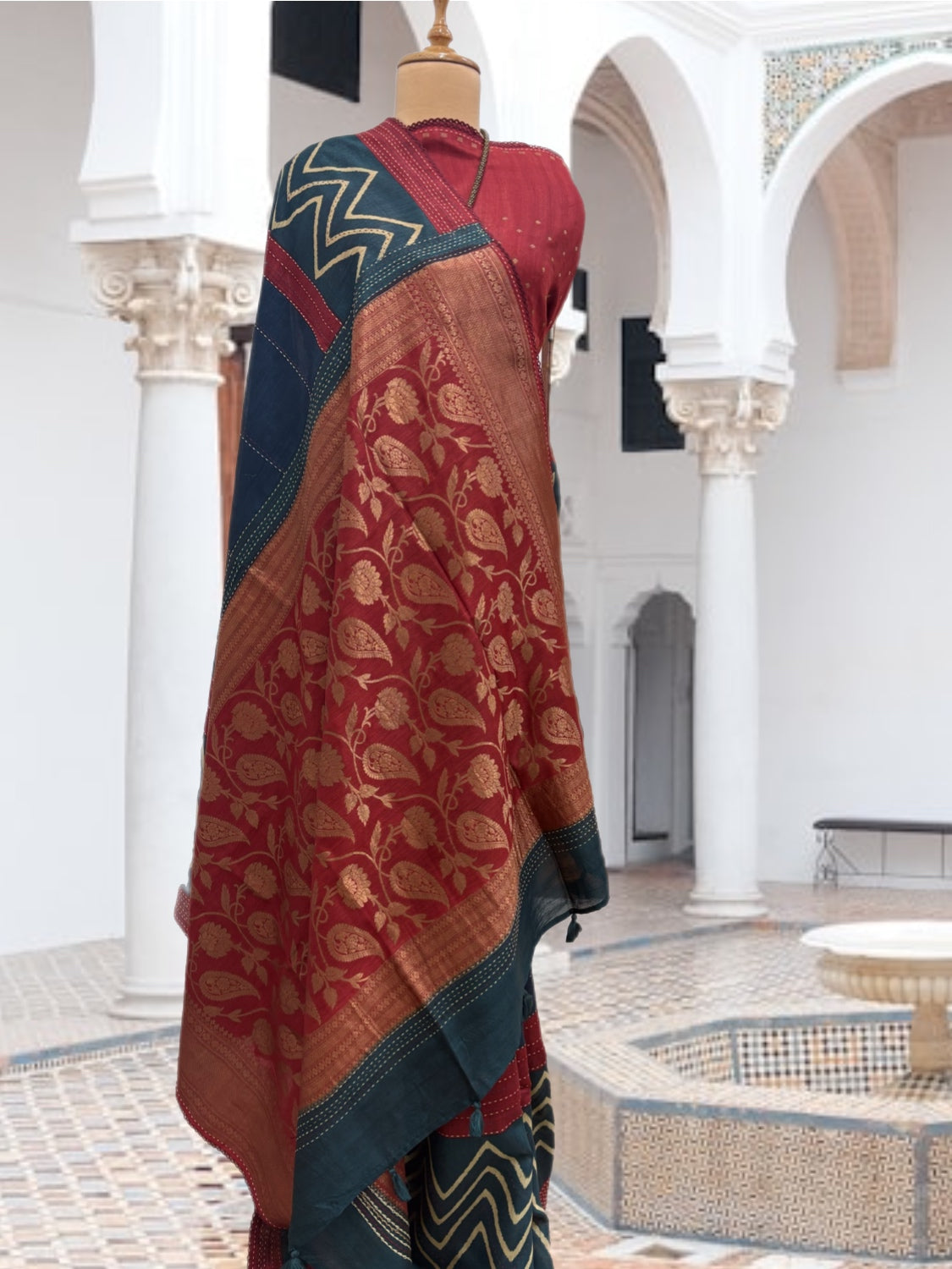 main body: Digital print geometric pattern in borders with kantha stich lines in centre & red woven zari jaal palla.