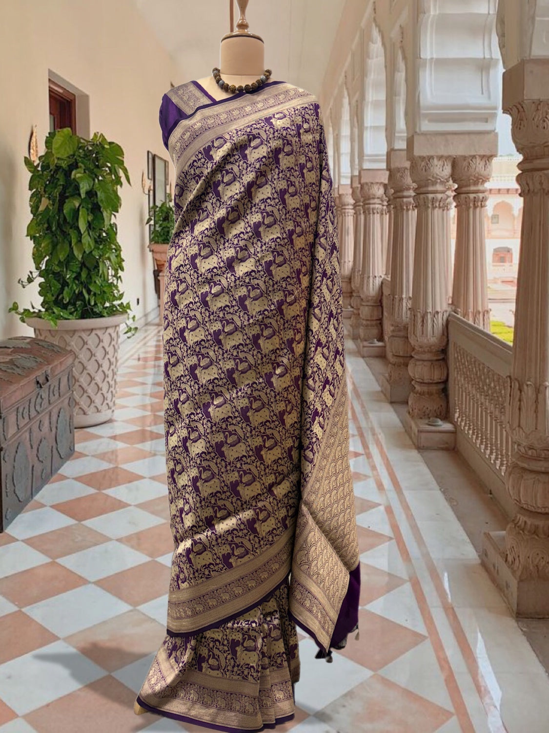 main body: Gold zari cow motifs jaal & flora and fauna in centre, border & palla woven in cutwork technique.