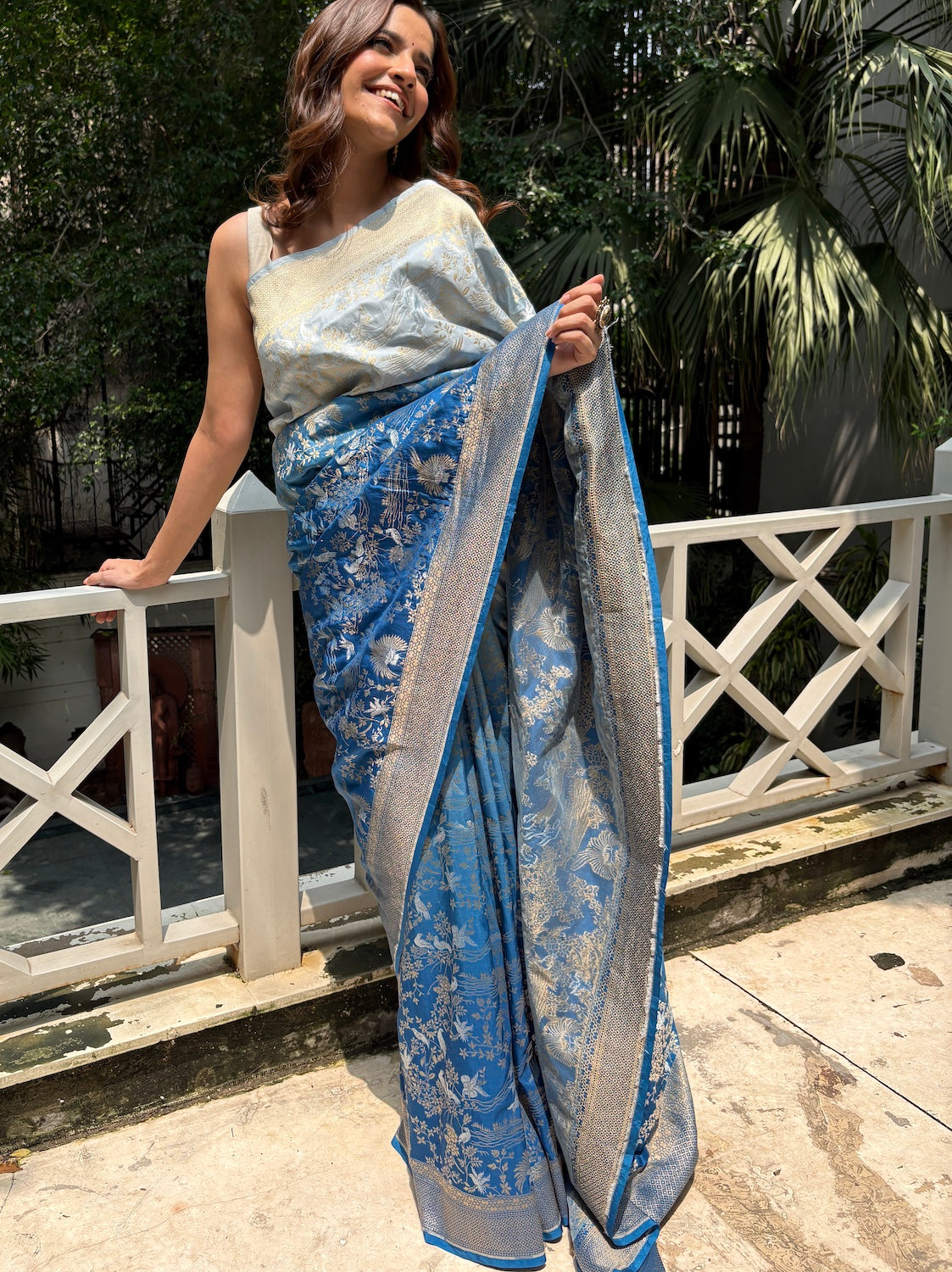 An occasion wear saree depicting swans on water inspired by Chinese tapestry design.