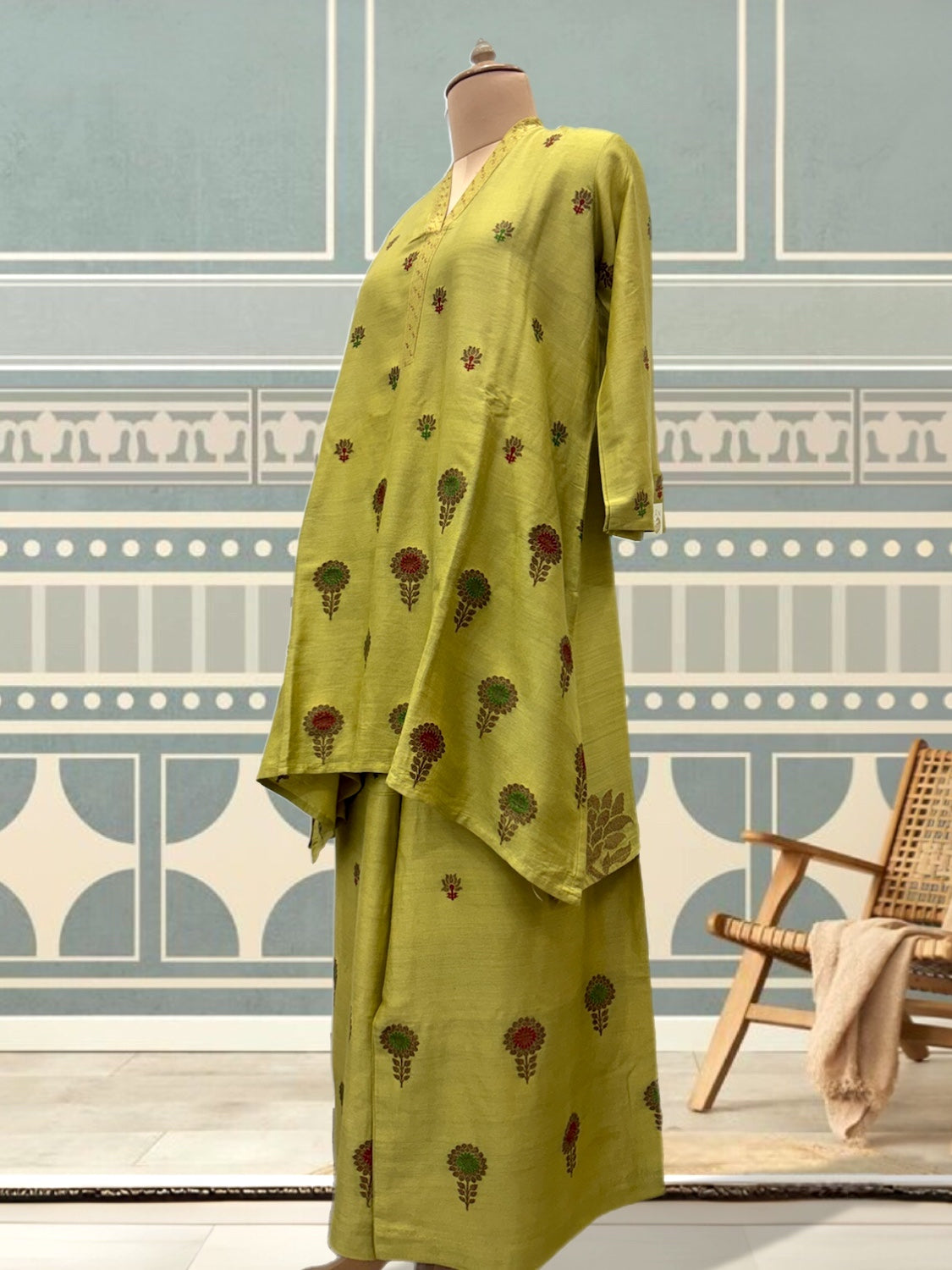 Bottom: Palazzo with handwoven zari & meenakari bootas. Pant has elasticized waist.