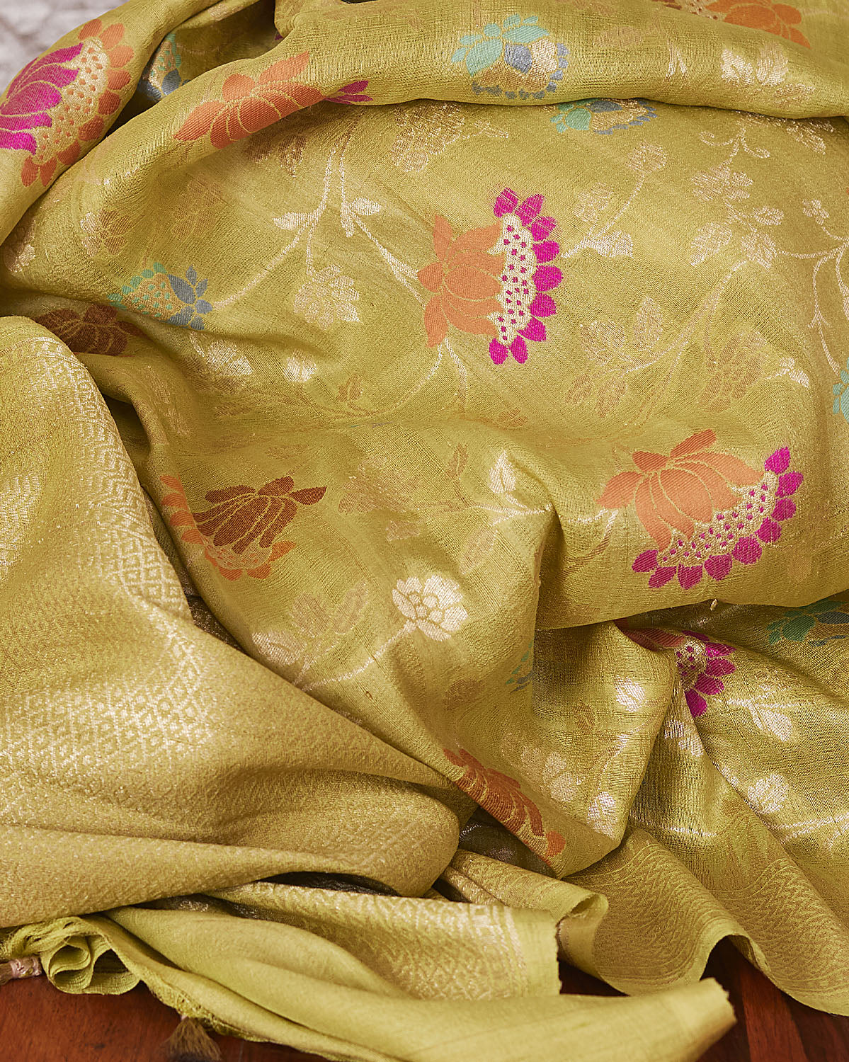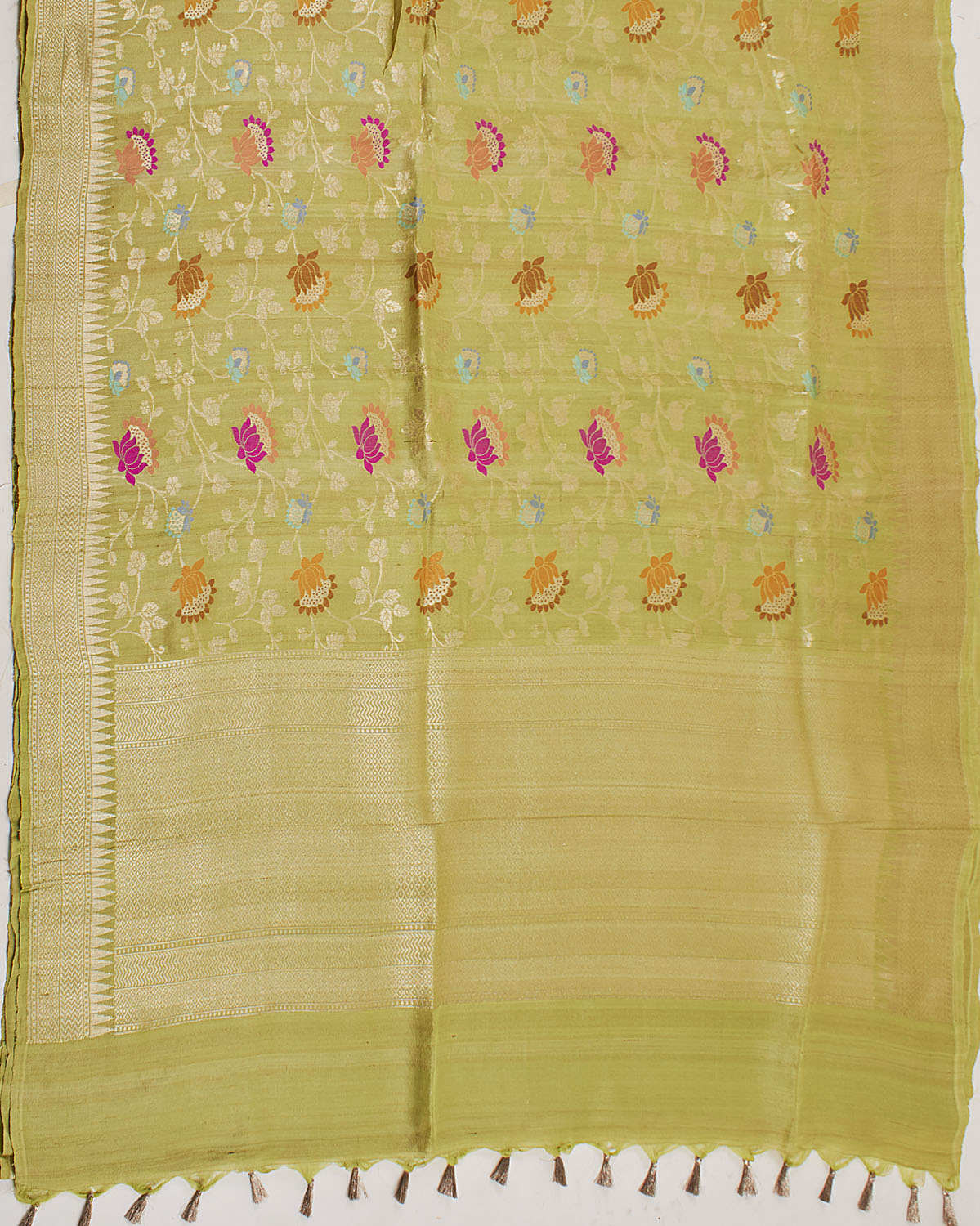 main body: Woven gold zari delicate lotus motifs meenakari cutwork jaal centre, gold zari kadhuwa meena border & palla.