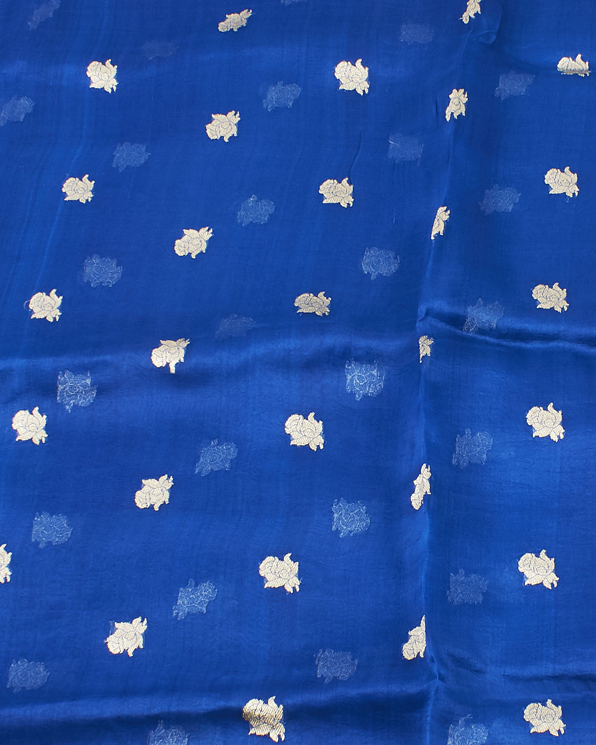 Main body: Gold zari rose pattern booti woven in centre with attached contrast peacock blue border and palla woven in kadhuwa technique in Kanchi kora style.