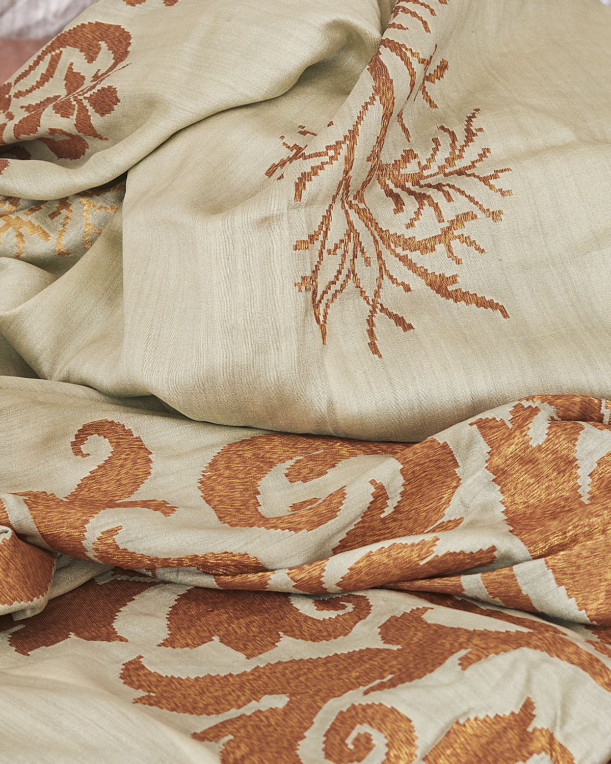Matka georgette fabric is a signature creation of Katan Weaves combining soft flowy georgette with luxurious rich matka silk. The saree drapes well with a rich sophisticated matte look.