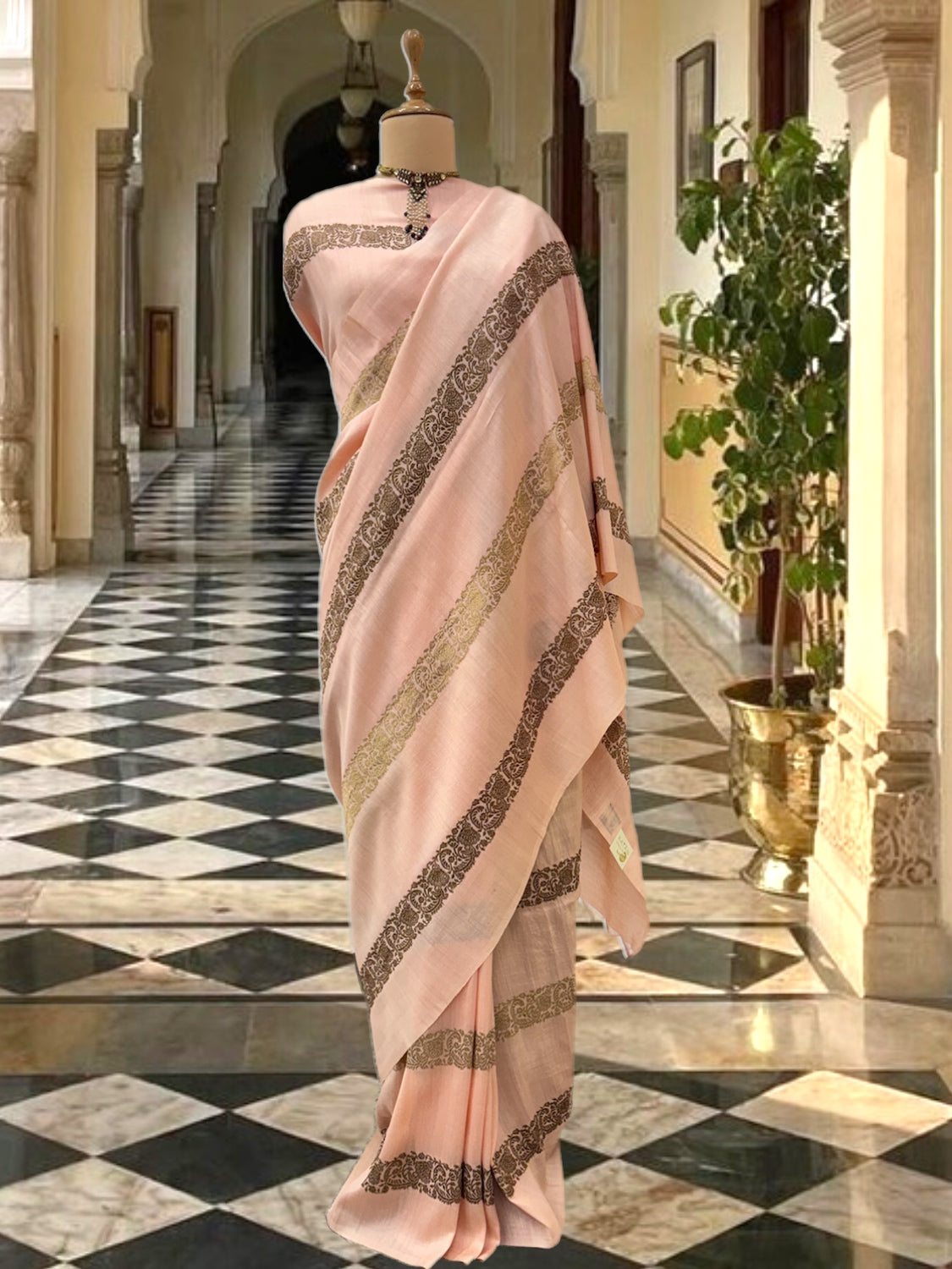 Matka georgette fabric is a signature creation of Katan Weaves combining soft flowy georgette with luxurious rich matka silk. The saree drapes well with a rich sophisticated matte look.
