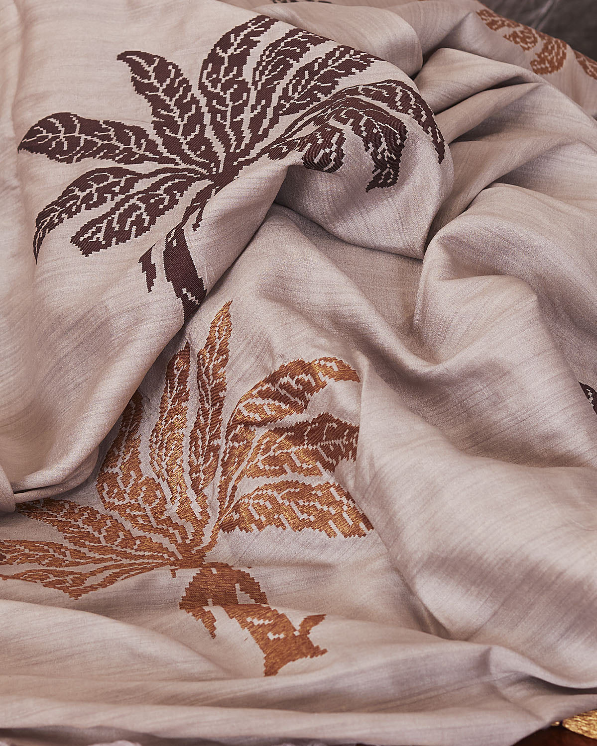 Matka georgette fabric is a signature creation of Katan Weaves combining soft flowy georgette with luxurious rich matka silk. The saree drapes well with a rich sophisticated matte look.
