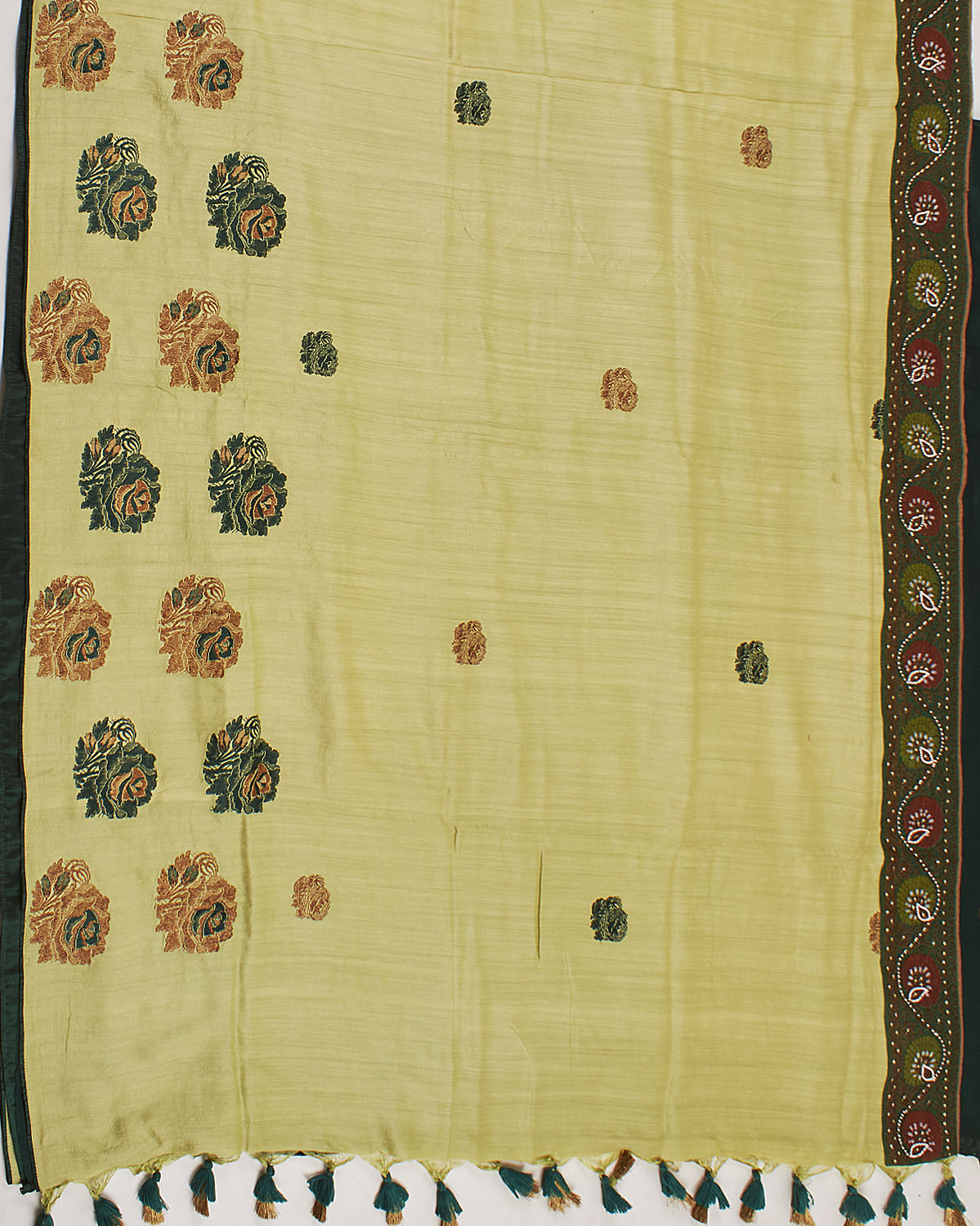 Main body: Rose booti centre with antique zari meenakari woven roses border on lower half of the saree. Saree does not have demarcated palla. Saree has an antique hand embroidered moti border attached on upper side.