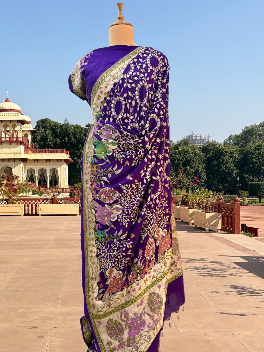 A unique & unusual georgette saree depicting Raas Lila in Nandan Van with three dimensional intricate meenakari, a master creation by Katan Weaves.