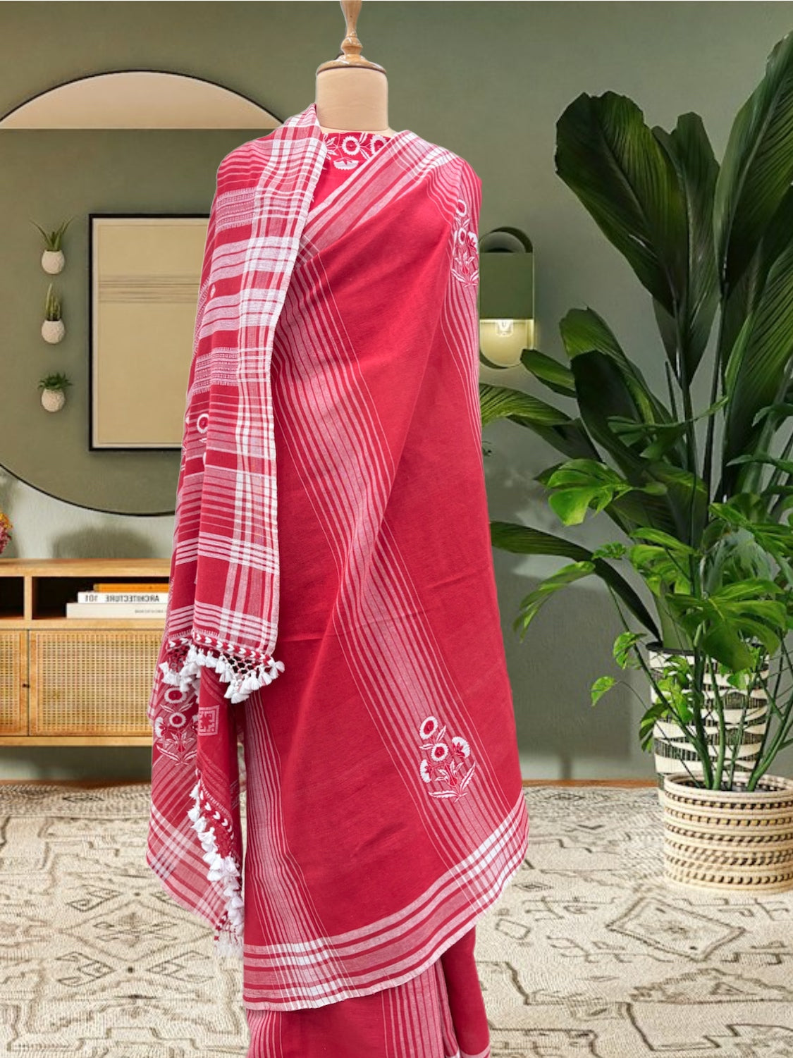 main body: Handloom woven ikat stripe centre with intricate tribal pattern palla in combination of red and white. Saree has appliqued floral bootas in centre and palla.