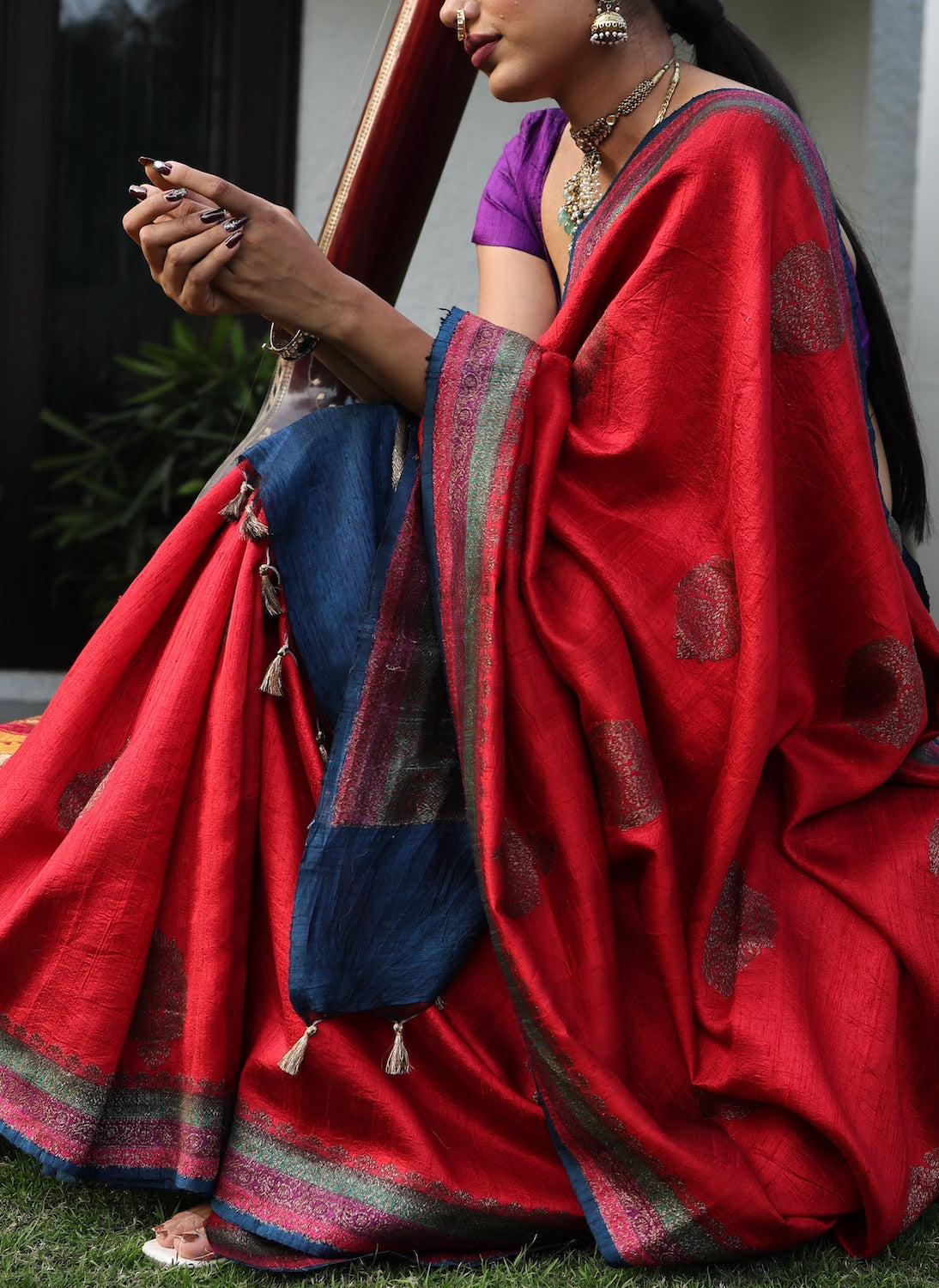 Saree color: Red saree with contrast purple and blue border