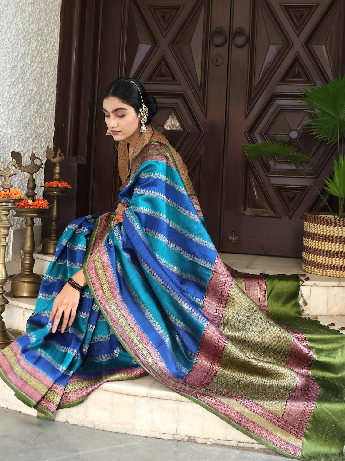 Main body: Light gold zari stripe centre dyed in rangkaat style in shades of blue with contrast purple & mehendi zari border & palla woven in cutwork technique. Saree has a mehendi green selvage.