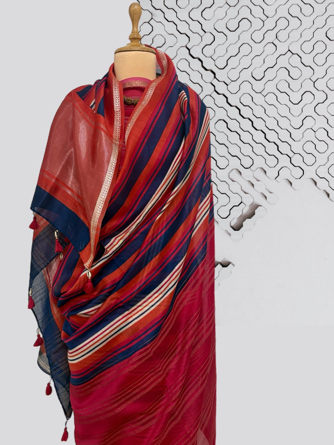 Main body: Stripe pattern digital print centre in shades of Ruby & blue with Ruby skirt border and palla. Saree has woven silver zari narrow border and woven gold zari stripe all over in base.