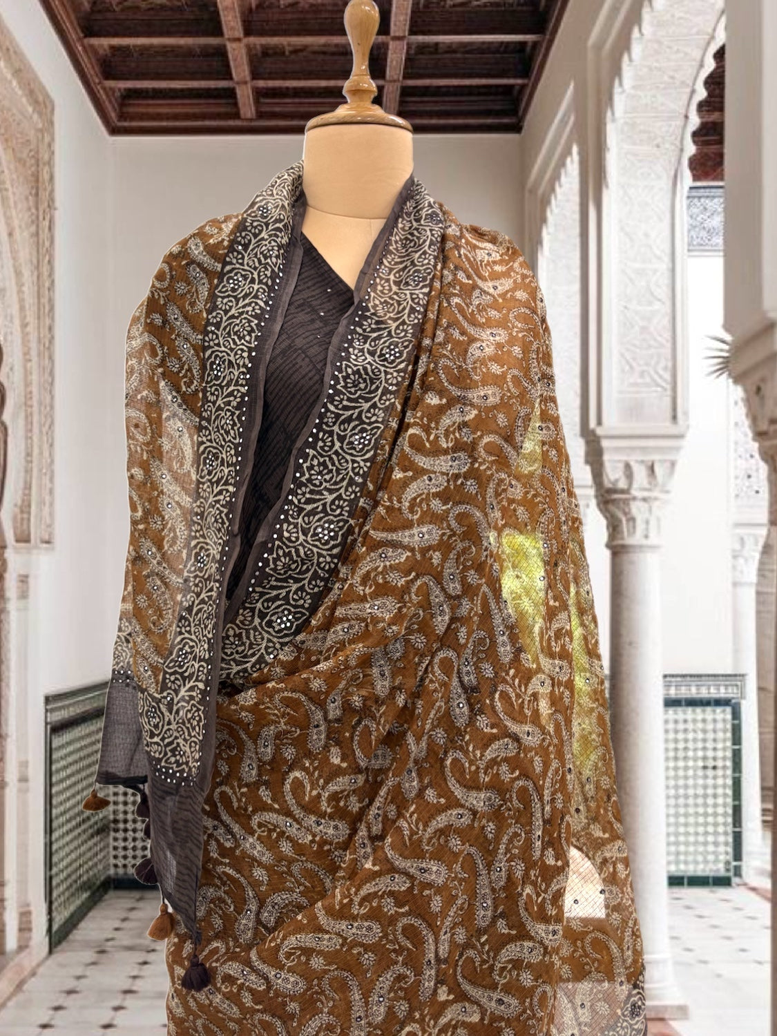 Blouse piece colour: Brown digital print with delicate hand embroidered mirror work.