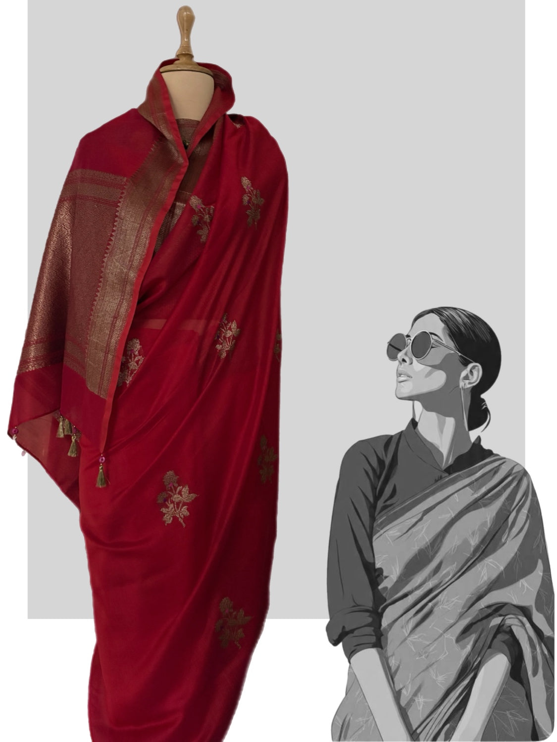 main body: Woven antique gold zari meenakari floral motifs centre, antique gold zari border & palla. Saree has a red selvage.